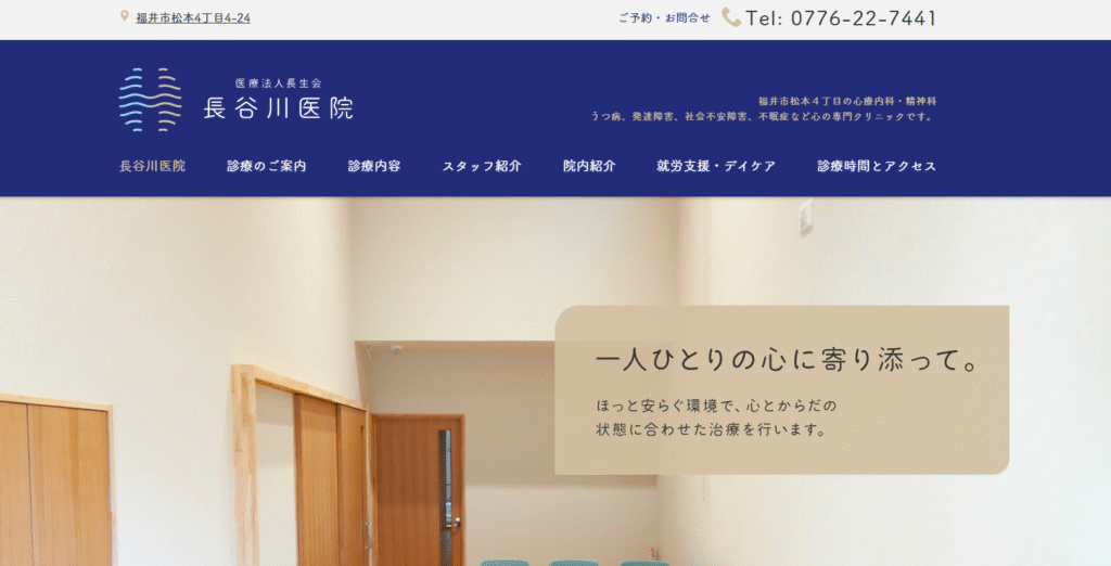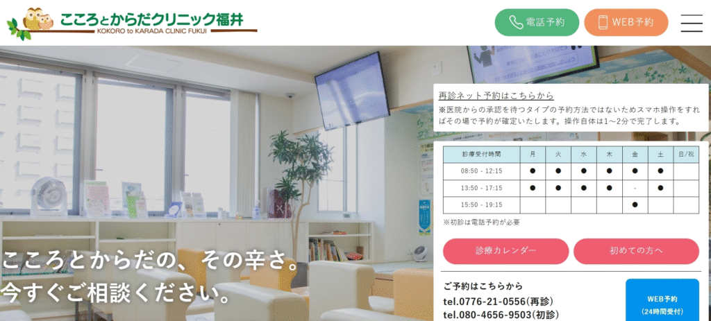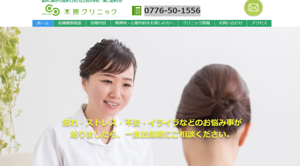 こころとからだクリニック福井は、その名の通り「こころ」と「からだ」の両方を総合的に診られる点が大きな特色です。内科、心療内科、精神科、児童精神科に対応しており、うつ病や不眠症といった心の不調から、風邪や高血圧、メタボリックシンドロームなどの内科疾患まで幅広く診療しています。