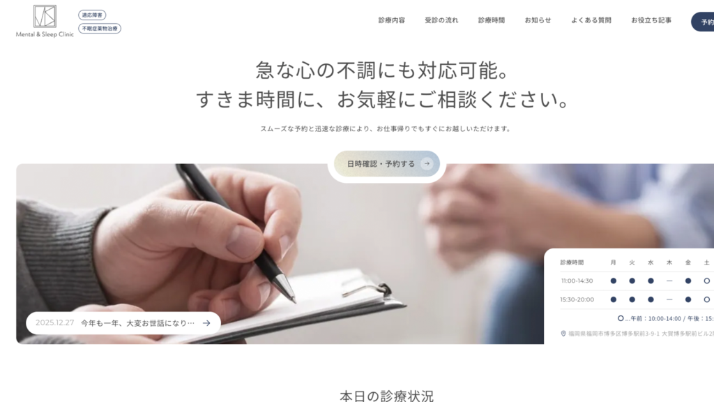 おおかみこころのクリニック-博多院-は、平日10時から19時まで診療を行っているクリニックです。完全予約制を導入し、WEBやLINEから最短5分で予約が可能。不調を感じたら当日でも診察を受けられます。
