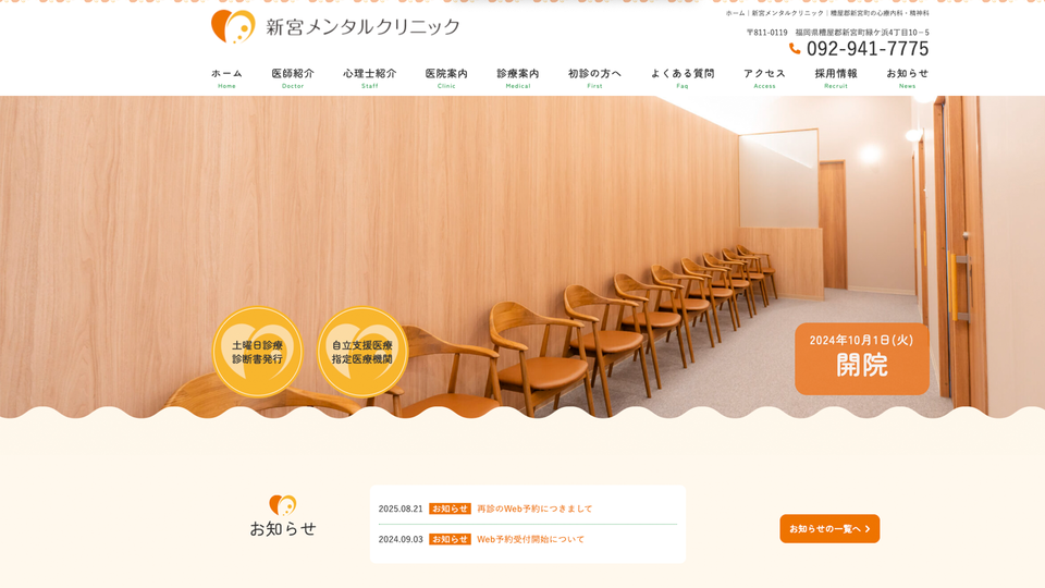 JR新宮中央駅から徒歩3分、駐車場も227台完備で、土曜日も17時半まで診療しているクリニックです。