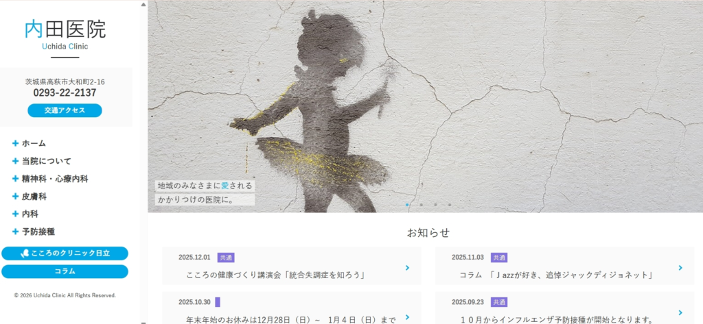 内田医院は昭和2年の開業以来、茨城県高萩市で地域医療を支えてきた歴史ある医療機関です。精神科・心療内科に加え、内科や皮膚科も併設しており、心身両面の相談を一つの医院で行うことができます。