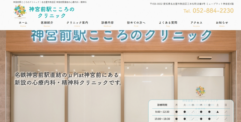 神宮前駅こころのクリニックは、名鉄神宮前駅に直結する商業施設「ミュープラット神宮前」の4階にあり、駅直結という利便性の高さが大きな特徴です。