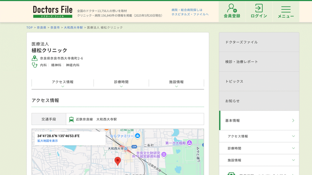 近鉄西大寺駅北口から右へ徒歩7分、平城宮跡西側という分かりやすい立地にあり、駐車場も完備されています。初診の方や3ヵ月以上経過の再診の方には予約をお願いしており、待ち時間を短縮した効率的な診療を提供しています。奈良県総合医療センターや済生会奈良病院などとの提携医療機関も充実しており、必要に応じて専門的な治療への橋渡しも行っています。