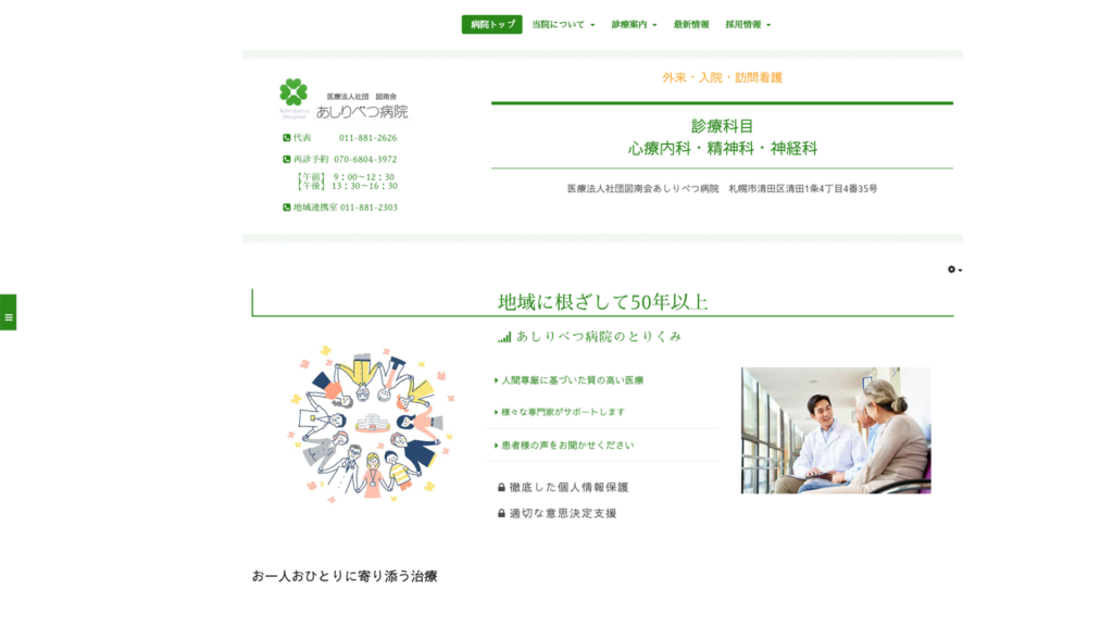 あしりべつ病院は、昭和35年に開院し、地域とともに歩んできた歴史ある精神科病院。急性期から慢性期、身体合併症まで幅広く対応しており、患者様の症状や気持ちに応じた医療を提供しています。