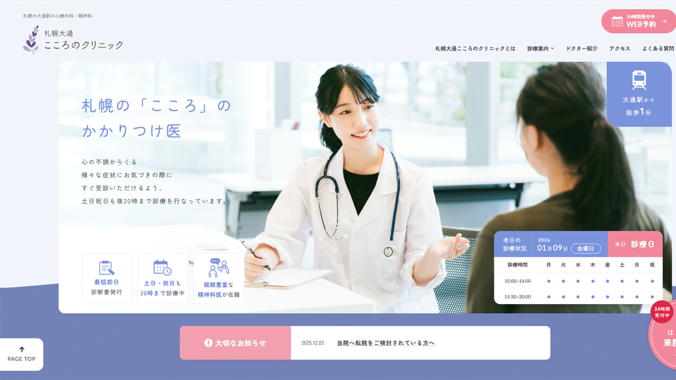 札幌大通こころのクリニックは、働いている方や平日が忙しい方でも気軽に受診できるよう、土日・祝日も夜20時まで診療を行っているクリニック。休診日がなく、大通駅から徒歩1分という駅近の立地で、仕事帰りや休日にも立ち寄りやすいのが魅力です。