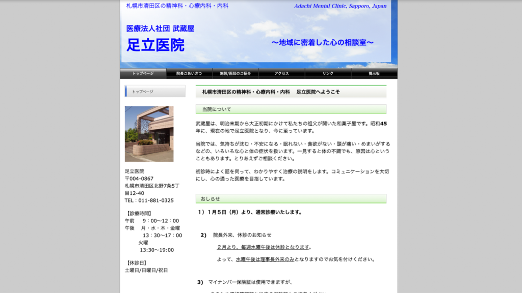 足立医院は、明治末期から地域で親しまれてきた歴史ある医療機関。気持ちが沈む、不安になる、眠れない、頭が痛いなど、心と体のさまざまな症状に対応しています。一見すると体の不調に思えても、原因は心にあることも少なくありません。
