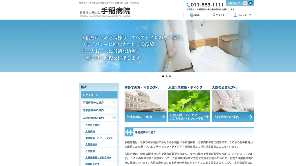 手稲病院では、入院治療をはじめる病棟の病室がすべてトイレのある個室となっています。主治医が病状に合わせて最適なタイプの個室を選択し、効果的に治療することで早期の退院を目指しており、プライバシーが守られた環境で療養できます。