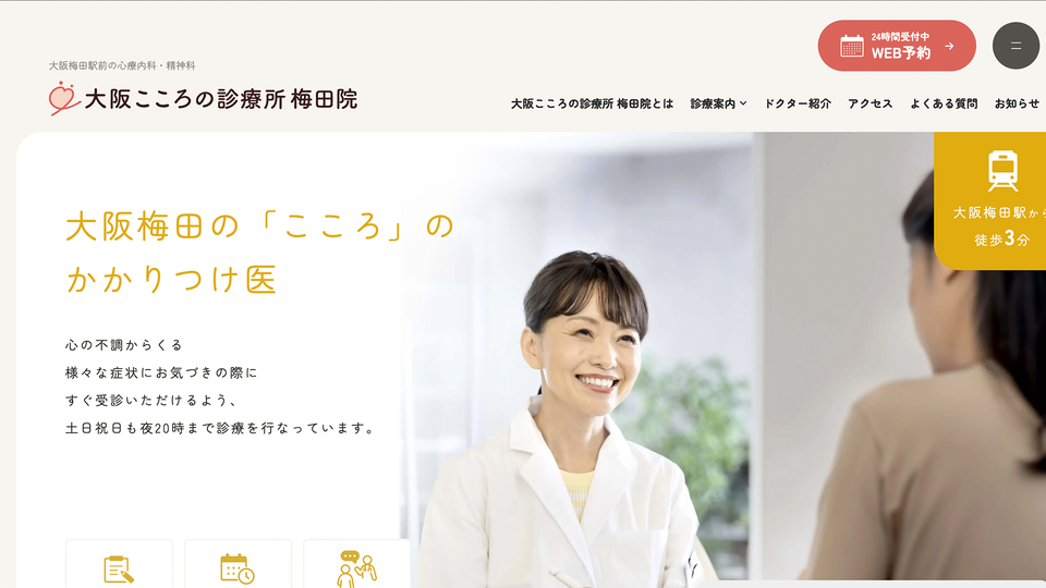 大阪こころの診療所 梅田院は、大阪梅田駅から徒歩3分という好立地にあり、平日は20時まで診療しているので、お仕事帰りでも通院しやすい環境です。さらに土日祝日も診療を行っているため、平日に忙しい方でも無理なく通院できます。初診・再診ともにネット予約に対応し、24時間いつでも予約可能。「つらい」と感じたときにすぐ相談できる体制が整っています。こころの不調を感じたときは、ひとりで抱えこまずに、大阪こころの診療所 梅田院への受診を検討してみてはいかがでしょうか。