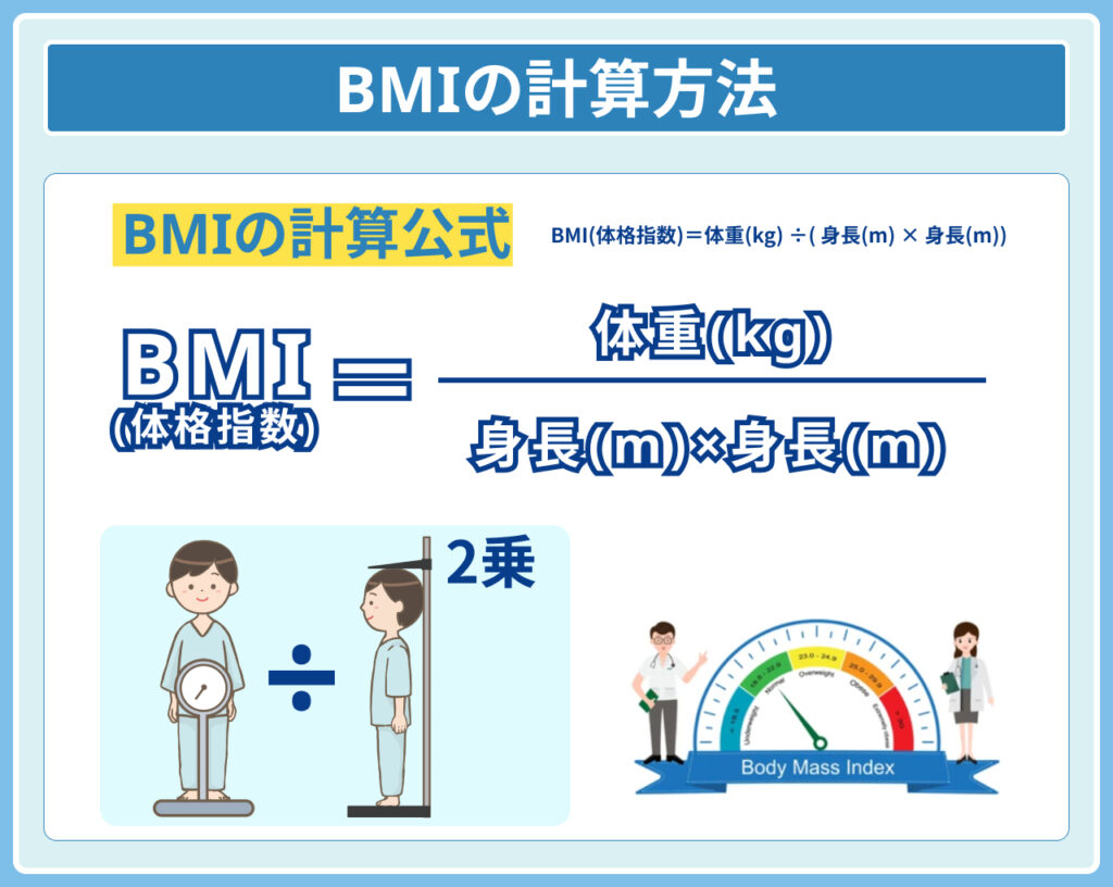 BMIは、体重(kg) ÷( 身長(m) × 身長(m)) = BMI(体格指数)の計算式で求められます。