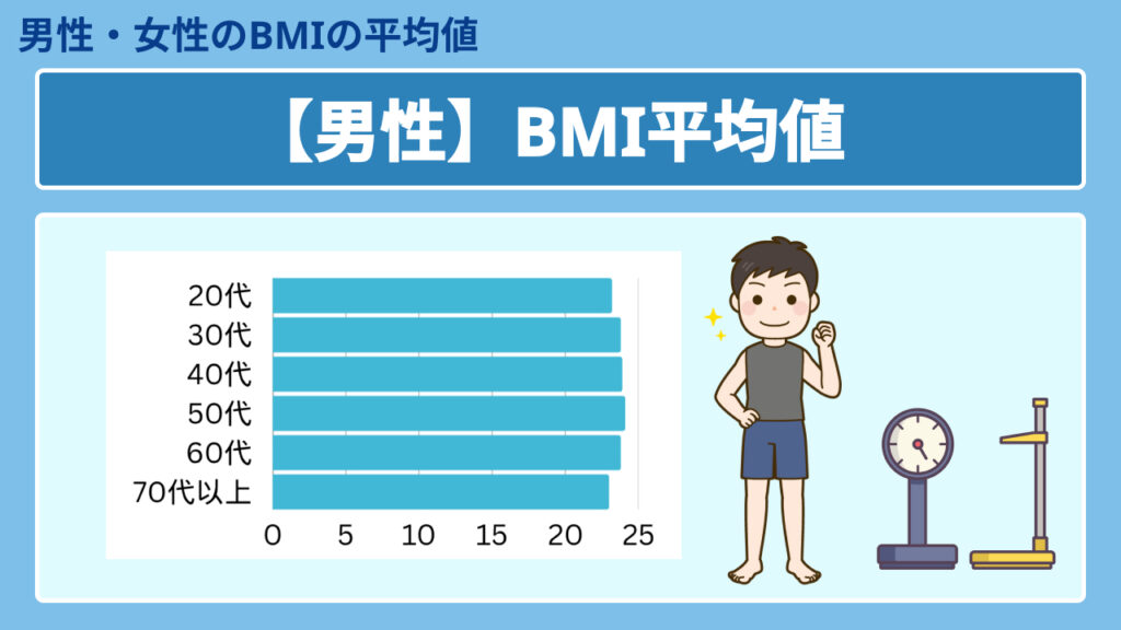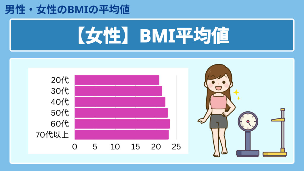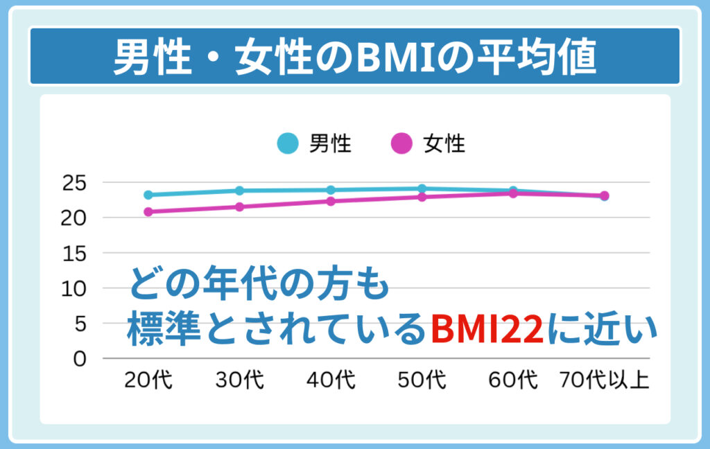 男女や年代によって、BMIの平均値に差があり、男性は筋肉量が多いため高め、女性は体脂肪率が高いため低めになる傾向です。