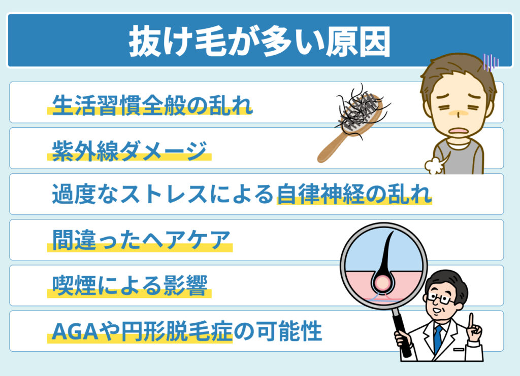 抜け毛が多くなる原因には、生活習慣の乱れやストレス、ホルモンバランスの変化など、さまざまな要因があります。