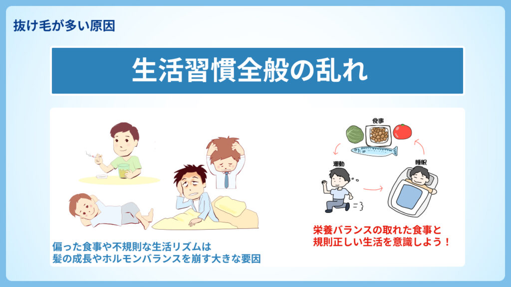 偏った食事や不規則な生活リズムは、髪の成長に必要な栄養やホルモンバランスを崩す大きな要因です。