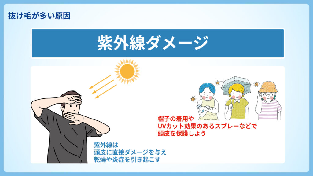 紫外線は頭皮に直接ダメージを与え、乾燥や炎症を引き起こすことで抜け毛の原因になります。