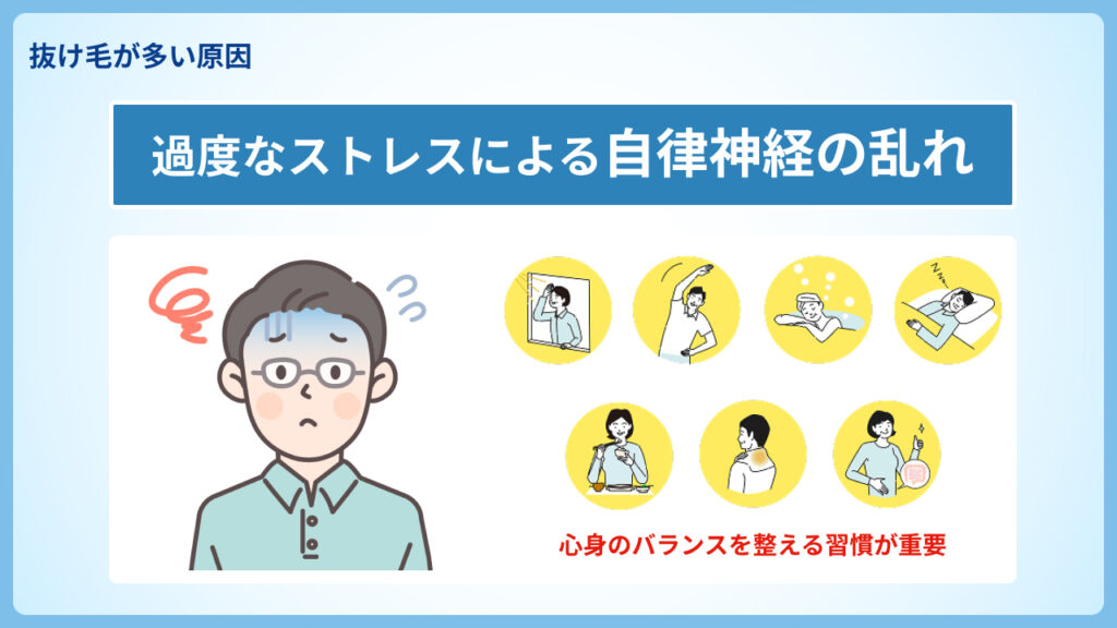 強いストレスを受けると、自律神経が乱れ、血管が収縮して頭皮への血流が悪くなります。