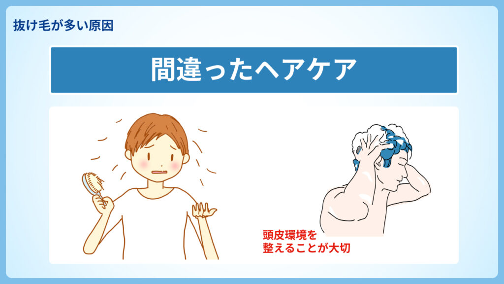 洗浄力の強いシャンプーの使用や、爪を立てて頭皮を洗うなどの間違ったヘアケアは、頭皮を傷つけて炎症を起こすことがあります。