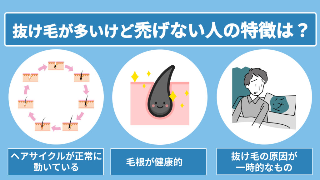 しかし、抜け毛が増えても禿げない人は、ヘアサイクルが正常に動き、毛根が健康で、原因が一時的であることが多いことが特徴です。
